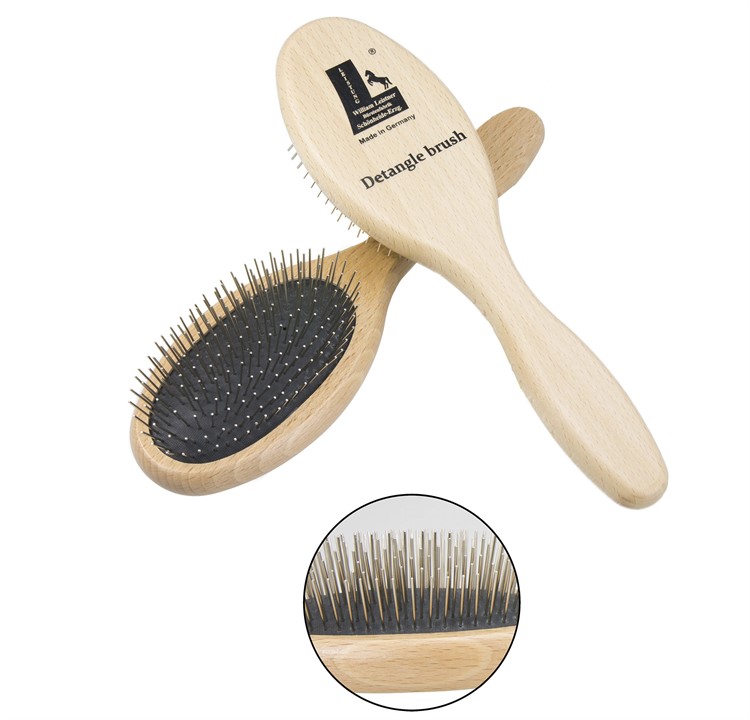 Från shopDetangle är skonsam mot man och svans. Helt suverän för att reda ut trassliga svansar och manar på ett skonsamt sätt! Att använda en bra borste är mycket viktigt då det tar flera år för tagelstrån att växa ut igen. För en tunnare svans och man är användningen av stålnålar utan knoppar bättre då den glider bättre genom håret. Vi rekommenderar att man i förväg använder en högkvalitativ svans och pälsglans. Piggarna sitter på en mjuk kudde av naturgummi som har en säkerhetsanordning på baksidan så att piggarna inte kan tryckas in i gummikudden. Piggarna är i rostfritt stål och är 1,7 cm långa. Borsten passar alla handstorlekar. Handtaget av naturligt lackerat bokträ från lokala skogar.