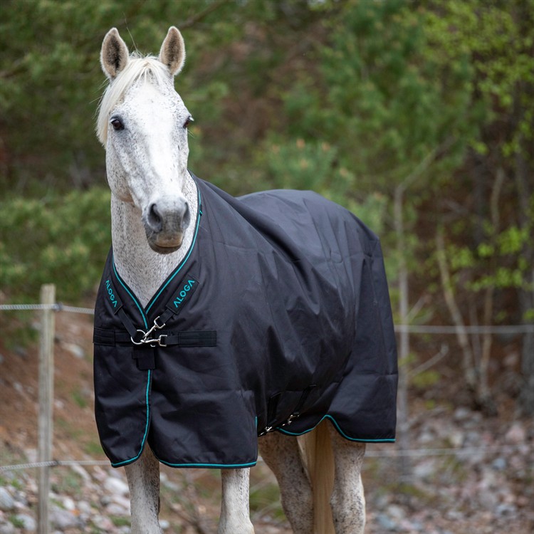 Från shopPro Turnout 0g från Aloga Equestrian är deras mest slitstarka, lätta utetäcke designat för hästar som vistas utomhus. Yttertyget i robust 1200D polyester är vattentätt och andningsbart, vilket ger ett pålitligt skydd för hästar som sliter hårt på sina täcken.